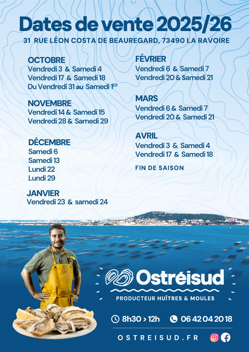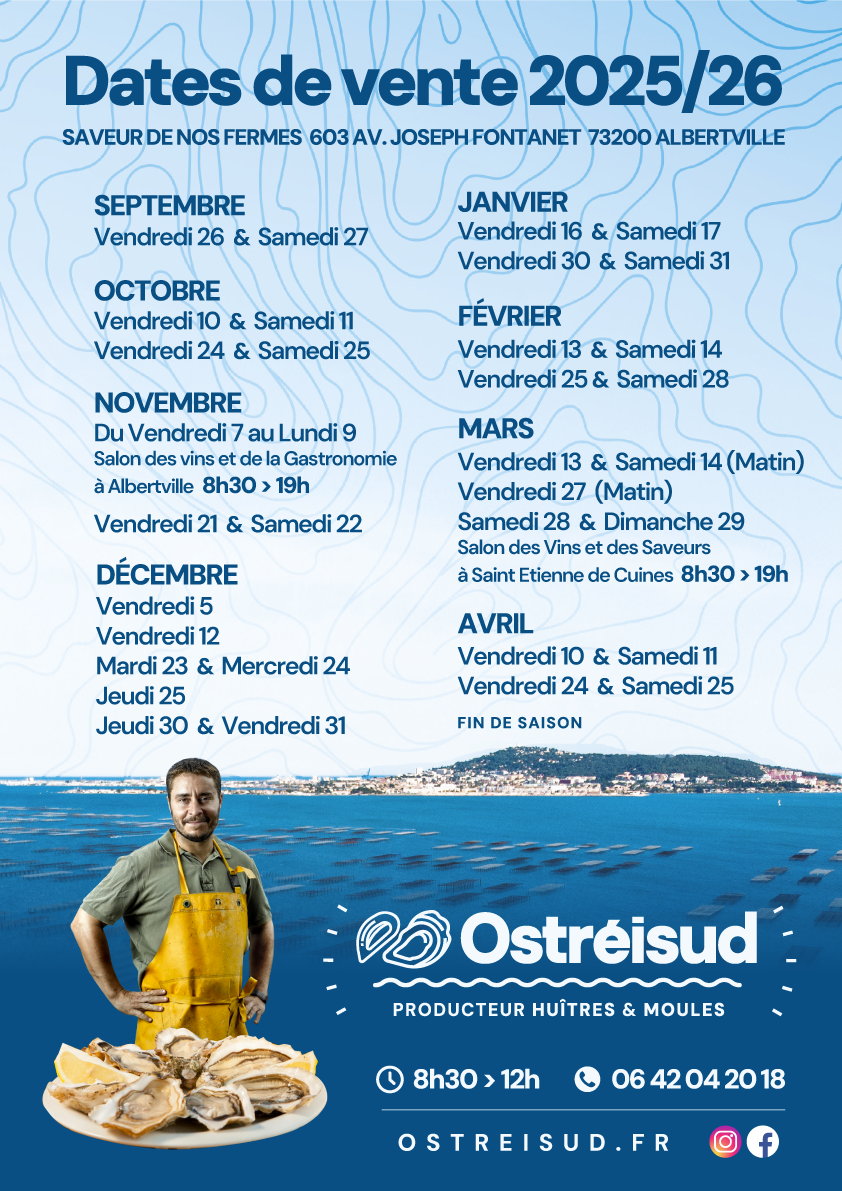 Les coquillages de méditerranée chez vous en Savoie Albertville Saveurs de nos Fermes603 avenue Joseph Fontanet – Espace Montaigne73200 Albertville Calendrier des dates et horaires 2025/26 Chambéry La Ravoire Paysanne31 Rue Léon Costa de Beauregard73490 La Ravoire Calendrier des dates et horaires 2025/26 Découvrez tous les produits Ostréisud La disponibilité des produits varie en fonction des saisons